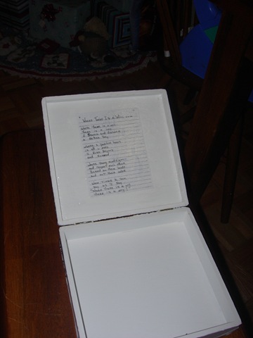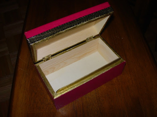 Using white glue (Modge Podge glue), a paintbrush, and some really cool, textured red cardstock I covered the box with the paper. The results are really great, although it's difficult to tell in the picture. My wife suggested using the ribbon trim. The inside lip around the box is finished in gold metalic paint, which accentuates the dragon theme.